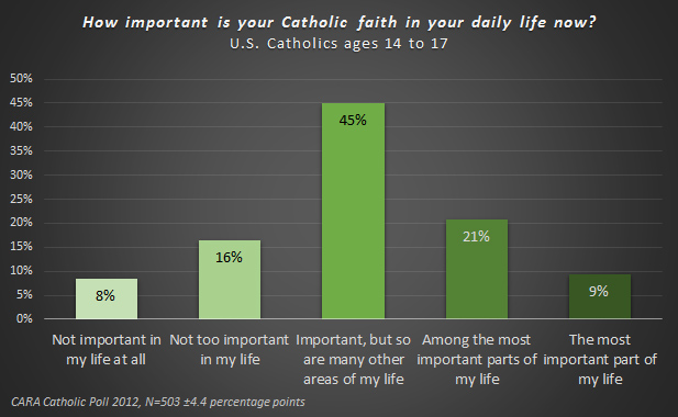 3. Importance of Faith. In the CARA Survey, 75% of teens said that the faith was important or very important to them. 25% said faith was not too important in their lives.